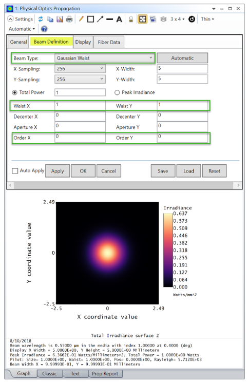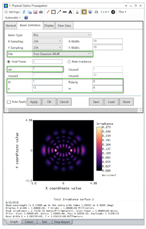 在这篇博文中,我们描述了OpticStudio中用于描述高阶激光束的模型.一旦确定,这种光束可以在任何光学系统中被设计在光学演播室使用物理光学传播。由矩形、圆形和椭圆增益光阑的激光腔产生的光束可以用厄米特-高斯,拉盖尔-高斯内高斯光束的可用模型来描述。 Hermite-高斯模 对于具有矩形对称的激光谐振腔,即具有矩形增益孔径的激光器,本文给出了相应的傍轴波方程的求解方法。Hermite-高斯模。这些模式的电场分布可以用Hermite多项式。这样的模式可以在OpticStudio中使用POP设置对话框中内置的“高斯腰”光束定义来建模: 这种模式的主要输入是光束在X和Y中的束腰,以及在X和Y中光束的阶数。上述设置演示了如何在X和Y中建立相同腰围的(0,0)模,对应于单模高斯光束。然而,输入光束也可能是在X和Y中不对称的高阶厄米高斯光束,例如:Hermite-高斯模通常称为Temm,n模,其中m是X中光束的阶数,n是Y中光束的阶数,再一次,高斯光束是TEM 00模光束。关于“高斯束腰”光束定义的输入参数的进一步描述,可在“关于物理光学传播”的帮助系统部分中找到。拉盖尔高斯模 对于具有圆柱形对称的激光谐振腔,即具有圆形增益孔径的激光器,本文给出了相应的傍轴波动方程的求解方法。拉盖尔高斯模,这些模式的电场分布可以用Laguerre多项式。这些模式可以在OpticStudio中使用OpticStudio安装中提供的“Laguerre波束”DLL建模: 该模型的输入是光束在径向(N)、方位角(L)、束腰(Wo)和模式旋转角(Phi0)上的阶数。请注意,指定phi0=0等同于建模奇数Laguerre-高斯模式(LGM),而指定phi0=90则等效于对偶数LGM建模。在OpticStudio安装文件夹中可以找到“LaguerreBEAM”DLL的源代码,默认情况下该文件夹是Documents\泽马克斯\dll\PhysicalOptics。文件夹的位置显示在文件选项卡.项目首选项.文件夹: 对于具有椭圆对称增益孔径的激光谐振腔,本文给出了相应的傍轴波动方程的求解方法。Ince-高斯模。这些模式的电场分布可以用INCE多项式表示。这些多项式在Miguel A.Bandres和Julio C.Gutiérrez-Vega(Josa,第21卷,第5号,2004年5月,第873页)题为“近轴波动方程和稳定谐振器的Ince-高斯模”的论文中作了简要描述。这些多项式的完整描述载于F.M.Arscott的“周期微分方程”一书(Pergamon出版社,牛津,英国,1964年)。 Ince-Gauss模式可以在OpticStudio中使用“Ince-Gauss”DLL建模: 此DLL包含在OpticStudio安装中,如上一节所述,可在文件夹{泽马克斯}\dll\PhysicalOptics中找到。将不提供此DLL的源代码。该模型的输入是p阶、m阶、束腰(W0)、光束半焦距(F0)和光束极性(0=偶数;1=奇数),这一输入决定了光束是用偶数多项式还是奇数因斯多项式描述的。Bandres和Gutiérrez-Vega提供了上述每一项投入的详细说明。列出了一些未使用的输入,以便该模型的输入表结构与OpticStudio中内置的高斯腰模型相匹配。 正如Bandres和Gutiérrez-Vega所描述的,构造Ince-高斯模光束轮廓的一个重要部分是解决给定输入集的特征值问题。利用CLAPACK库中提供的子程序,在Ince-高斯DLL中解决了这个特征值问题。这个库是免费的, 从束腰和半焦距出发,可以计算出无量纲椭圆度参数: