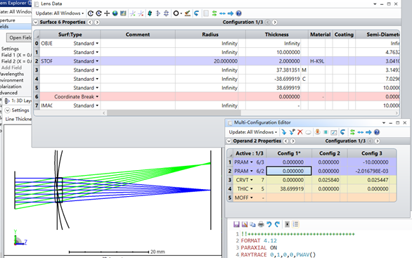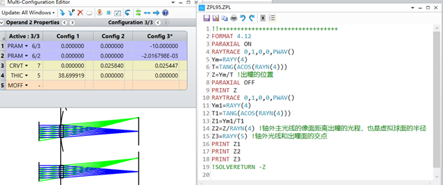 在操作数中OPDC和数值和OPD扇形图中数据完全相同。知道所有的计算参考面是出瞳不同的视场主光线和出瞳相切或相交,ZEMAX是从像面反向追迹到出瞳。以实际主光线和像面的交点为圆心,以主光线和出瞳的交点与像面交点之间的光程和为半径。虚拟一个圆作为最后一个面。为了说明轴上光线和轴外光线建立了多重结构。 第一个结构是一般,我们对于一个镜头看到的OPD值,结构二是轴上点,结构三是轴外点。 第一个结构的OPDC在操作数就是我们的比较结果,这个结果和扇形图上数据一样。另外两个结构用PLEN操作数计算。