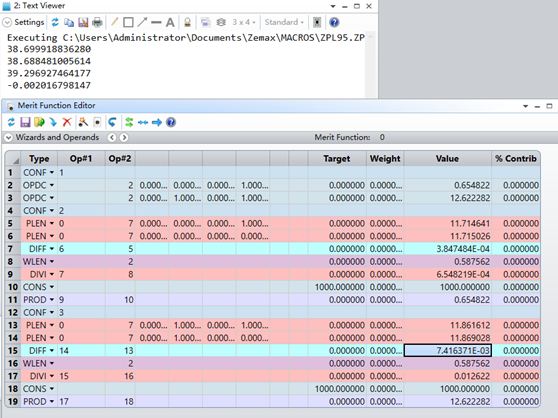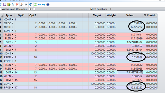 结构一中得到的OPDC和OPD扇图上是不回算到出瞳的像面上一般显示的光程差。两个视场 0和1的光程差分别是0.654822和12.622282。