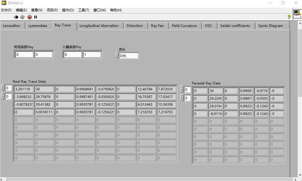 一直想深入的了解ZEMAX的一些计算方法,于是参考袁旭沧《光学设计》自己用labview软件光学追迹做了一些小程序,目的是学习,结果是几何光学的结果和ZEMAX比对结果都很完美。