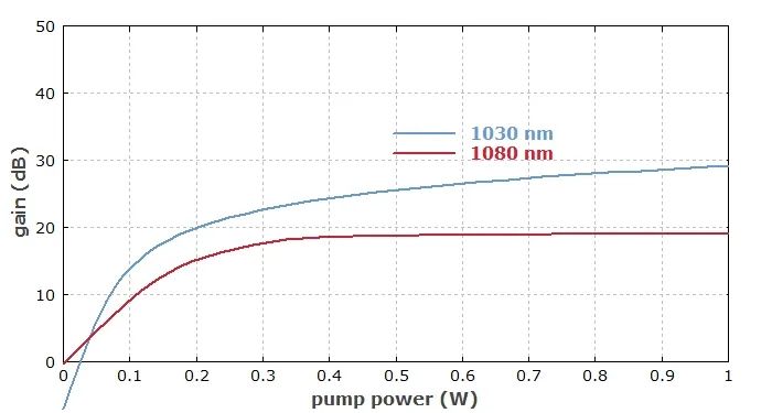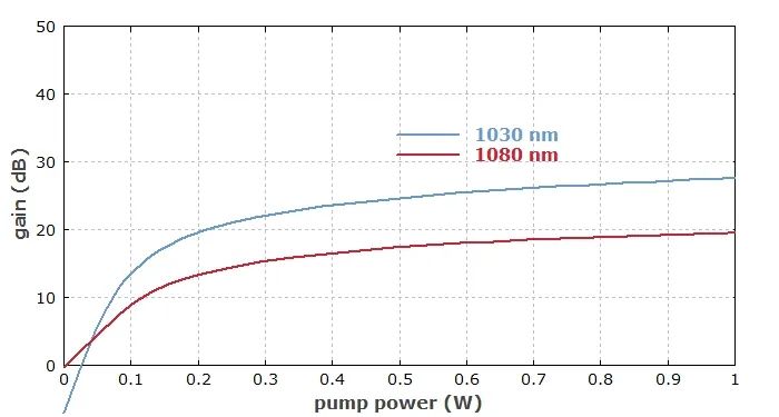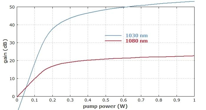 与使用 940 nm 泵浦的情况相比,曲线的形状发生了很大变化;有一个更难的增益钳位。然而,这与泵浦功率没有被完全吸收的事实有关。超过一定水平,任何额外的泵浦功率只会在另一端出现。使用稍长的纤维,结果看起来会有所不同: