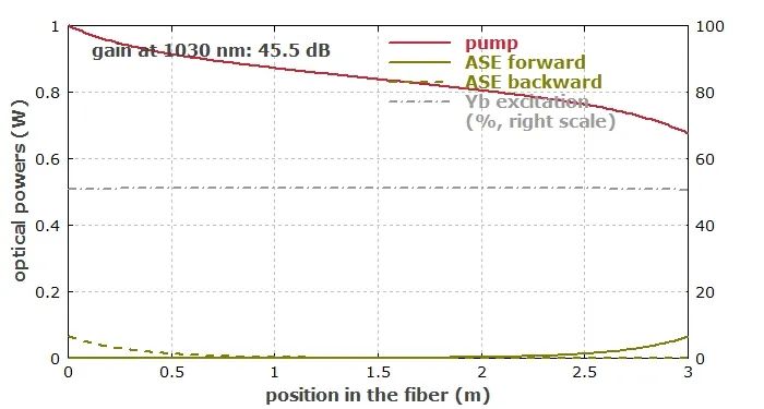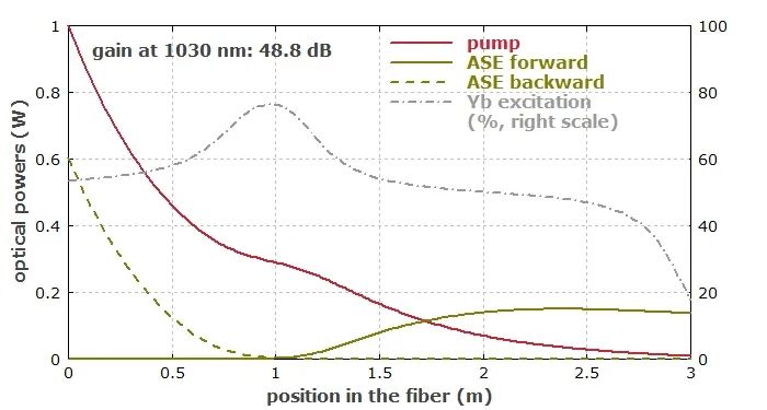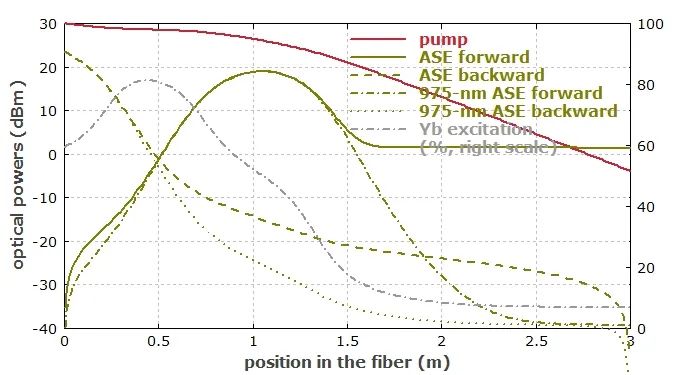 示例 2:在 975 nm 泵浦的掺镱光纤放大器中的 ASE如果我们改变泵浦波长,ASE 行为会发生很大变化。例如,让我们泵浦与之前相同的光纤,但在 975 nm 而不是 940 nm 处。在这种情况下,975 nm 处永远不会有净增益,因为泵的受激发射将激发密度限制在大约 50%。 图 5 显示了功率分布和 Yb 激励: