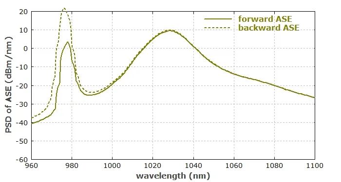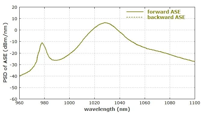 尽管 975 nm 处的吸收截面远高于 940 nm 处,但泵浦功率现在不能在 3 m 的光纤中被完全吸收,这可能是非常令人惊讶的。这种现象不是由于 ASE 造成的;它也发生在 ASE 较弱的较低功率水平上。原因是 975 nm 的泵浦饱和度更强。理解它的最好方法可能是考虑吸收的泵浦光的能量必须通过自发发射消散;Yb 离子没有其他方法可以摆脱这种能量,并且平均只能吸收尽可能多的光子因为它们可以辐射出去。用 975 nm 泵浦实现的较低激发密度(由于受激发射强)意味着每厘米光纤辐射的能量较少,可以吸收的泵浦功率也较少。一个不太重要的因素是 975 纳米光子具有较低的能量,因此您可以在相同的功率下获得更多的光子。 我们现在查看正向和反向的 ASE 光谱,发现它们现在几乎相同: