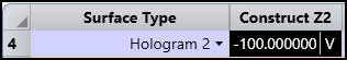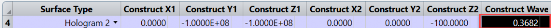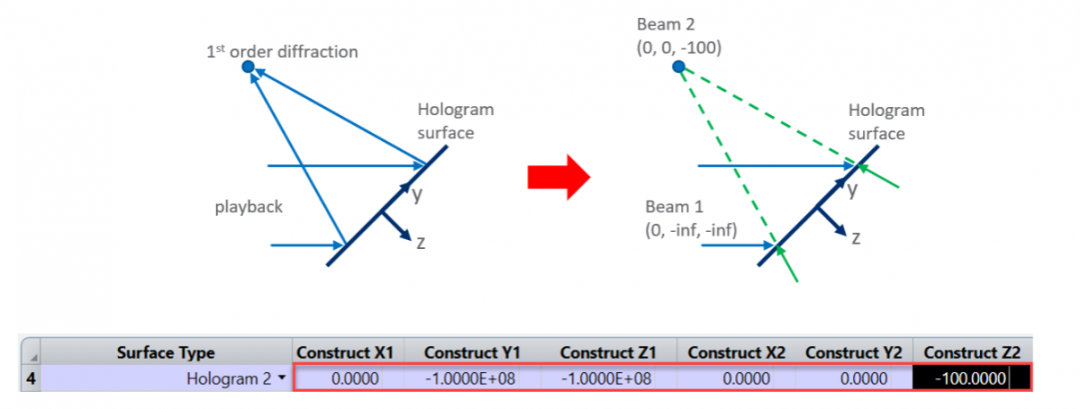 接下来我们将设置全息图,所以需要定义两个构造光束。为了从全息图中获得衍射光的方向,构造光束必须经过准直,光束2必须汇聚成一个虚拟焦点。我们需要使用全息图进行反射,所以它的材质必须设置为“ 镜面 (Mirror) ”。这明确地表明OpticStudio光线在到达全息图表面后将以相反的方向传播。 根据这个思路,我们将构造光源点的坐标 (x, y, z) 设置如下。光束1是准直光束 (0, -∞, -∞) 。光束 2 的构造点设置在 (0, 0, -100) ,这样会使光束聚焦在离全息图100 mm的地方。