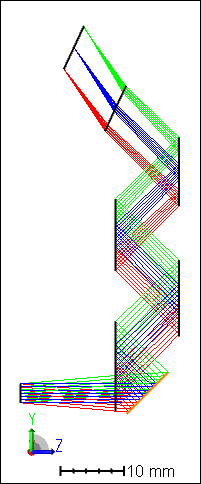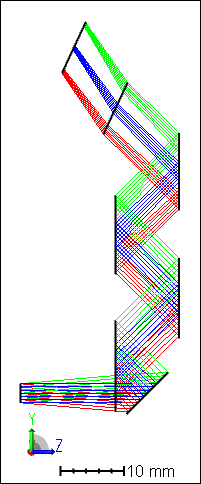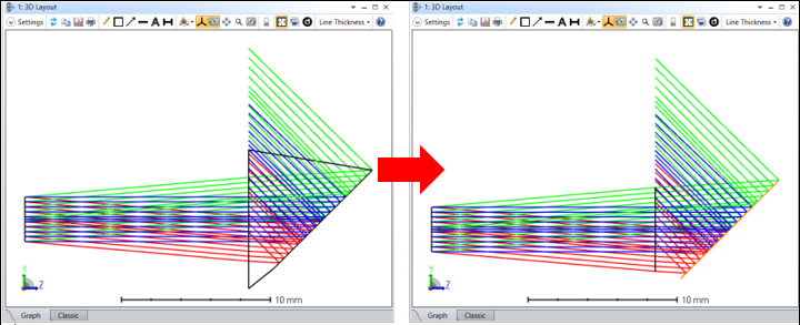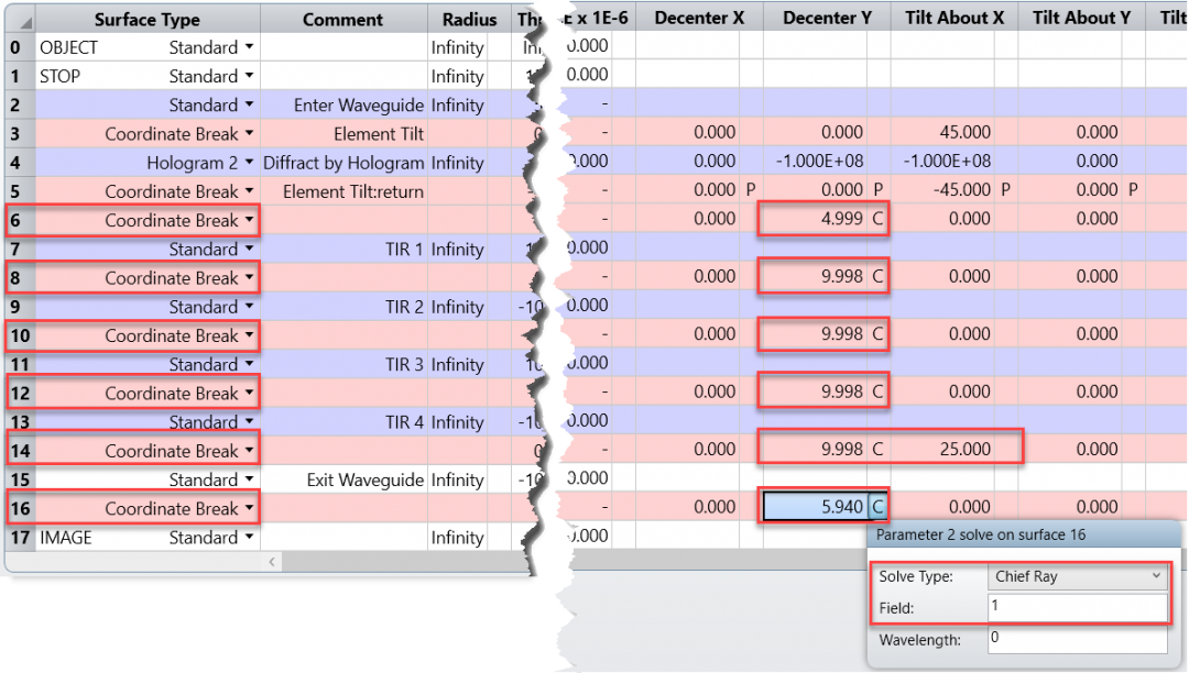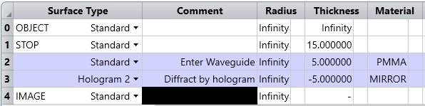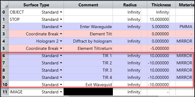 为了模拟光在波导中的传播,我们在全息图表面之后再添加5个表面。前4个表面模拟波导的侧边,光在那里发生全反射 (TIR) 并从最后一个表面离开波导材料。