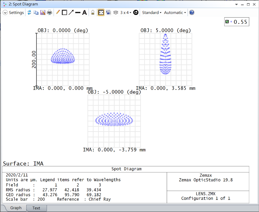 第一次优化的结果显示了在像面上实现最小的RMS光斑半径时所需的全息图光焦度最佳结果。有了初始设计之后,我们将对这个系统进行一系列优化,包括扩大FOV、增加入瞳的直径(相当于增加眼动范围)、使波导更薄等。