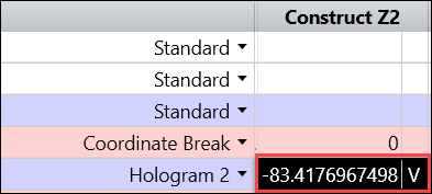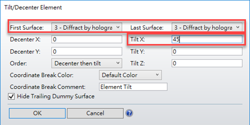 首先在光阑后添加两个表面,设置如下图所示。然后使用倾斜/偏心工具将全息图表面围绕 X 轴旋转45度。