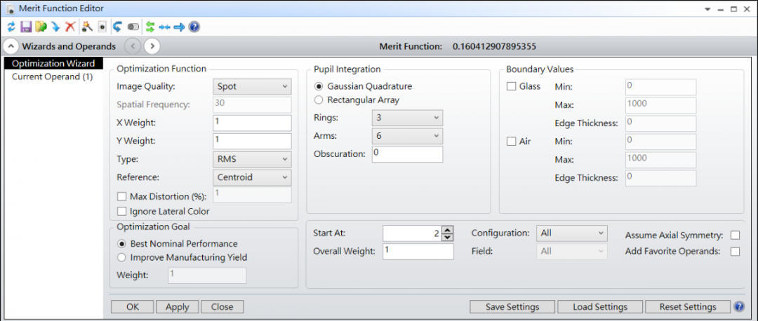 准备优化至此,初步设计已基本完成,我们将开始优化系统。首先,使用优化向导设置RMS光斑大小作为像质标准。然后将构造Z2设置为变量,这样我们可以快速修改全息图的光角度。