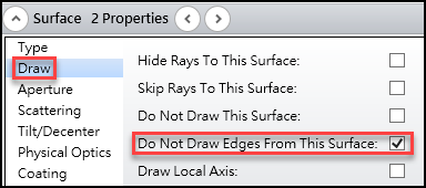 为了更方便查看布局图,我们可以使用一个小技巧。由于绘制两个表面之间的边缘是没有意义的,所以转到表面属性 (Surface Properties) …绘图 (Draw) 并勾选选项“ 不显示此表面边缘 (Do Not Draw Edges From This Surface) ”。将此设置应用到表面 2 到像平面之间的所有表面。
