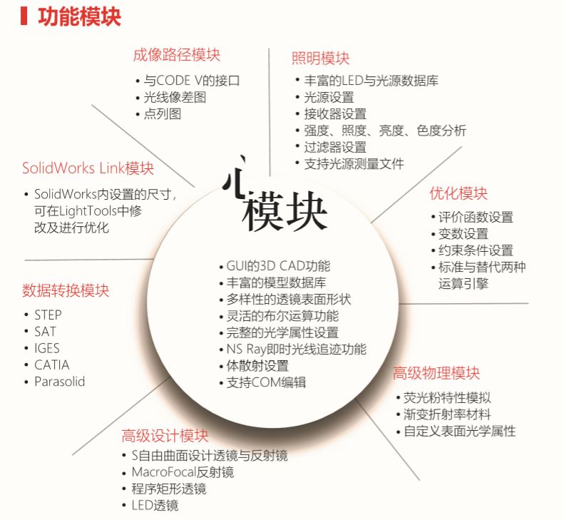 ZEMAX的技术性能 软件可以实现的主要功能 ●几何光学设计:成像镜头设计、成像质量分析、温度环境分析、加工公差分析等 ●物理光学设计:激光系统及元件的设计及分析,光学相干衍射特性分析、光纤耦合等 ●照明系统设计:照明系统的设计,光机设计,和3D模型软件动态链接,光源库等 ●ZPL语言扩展:自带的编程语言可以实现功能的扩展 ●扩展功能:可以和C语言、C++、VB等编程语言进行配合使用 ![]()