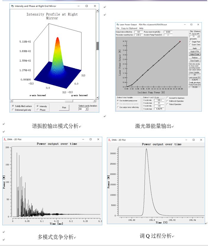 ASLD在设计时就考虑到,目前也具有对连续波长和脉冲激光器的输出功率,多模分析以及光束质量的分析的功能。该软件也能够准确计算激光晶体内部的机械、光学以及热透镜效应。更进一步的,ASLD包含了强大而有效的算法来准确仿真分析系统谐振腔的稳定性和输出能量。 ASLD所具有的图形化界面允许用户直接在泵浦腔或激光谐振腔内中插入元件,并通过相应的窗口来定义光学元件的结构和特性参数。并且,仿真数据可以通过相对应的窗口来进行调整。这样通过图形界面调整元件结构及参数的操作能够大大提高系统设计效率。 功能特点: 热透镜效应分析 ASLD 能够分析热透镜效应中随时间变化的结构和热分布。在使用脉冲泵浦光源时需要使用该功能。热透镜效应主要影响激光器的稳定性,输入功率以及光束质量。 光束质量和输出功率分析(DMA) ASLD 依靠光束半径,泵浦光源、谐振腔参数,以及相关的光学结构如Irises以及Gaussian output couplers来计算系统能量及光束质量。 激光器稳定性及束腰分析 ASLD通过对系统谐振腔参数和晶体热效应的仿真来计算得出固体激光器的稳定性及束腰参数。 泵浦光源分析 ASLD内部整合的光线追迹模块能够对泵浦光源进行仿真可以如下特性进行仿真: ·光谱吸收 ·散射效应 ·光路反射 主动Q开关、被动Q开关、SHG ASLD能够对系统内的主动和被动Q开关进行脉冲能量、脉冲宽度、光束质量以及泵浦频率进行分析。并且当系统内部包含可饱和吸收器时,能够对其的基态和激发态吸收横截面数据进行仿真分析。 参数分析 ASLD内置参数分析工具。该工具能够帮助工程师对激光器的效率进行优化分析。 材料数据 ASLD包含激光晶体的材料数据。并且用户可以根据自己的需求随时添加新的材料。 ● DMA模型分析多模竞争和调Q过程 ![]() ![]()