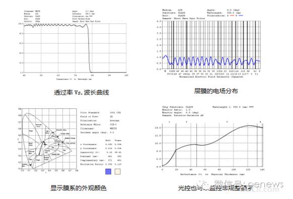 更重要的是这款软件集成了各种分析功能,反射率、透过率、吸收率、椭偏参数分析;电场强度分布曲线;膜系反射和透过颜色分析;晶控曲线计算;膜层公差与敏感度分析;良率分析。TFCalc Reoptimize还可以与镀膜机进行联机,及时补偿镀制前层膜时的公差,保证最后成品膜的性能合格。最后还能和Matlab等其它软件一起使用,支持对膜系性能的分析。
