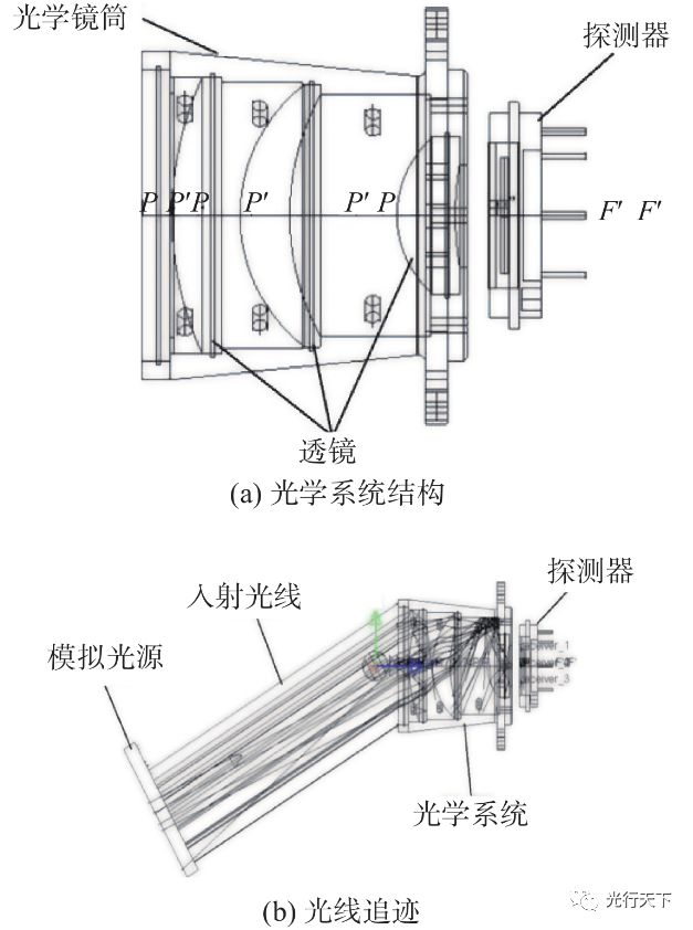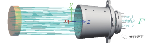 图2.光学系统模型 1.3 探测器系统整体建模 将光学系统和四象限探测器按照设计要求布置在指定位置。然后在光学系统前面设置光源,模拟目标光线的入射,建立探测系统的整体模型,如图3所示。