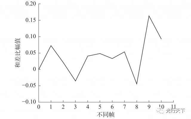 图8.激光散斑效应仿真 假设在不同帧时散斑分布是不同的,随机模拟10帧不同散斑图像,加载在0°视场的情况如图9所示。这10帧不同的和差比幅值如图10所示。
