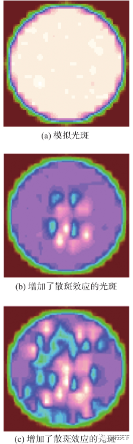 图7.落在探测器上的光线 2.3 散斑特性仿真 激光具有非常好的相干性,容易产生干涉现象,当激光照射物体的漫射表面,或者通过一个透明的漫射体时会在其表面以及附近空间产生无规则分布的亮暗斑纹,即激光散斑。这是一种干涉现象,而且散斑在各种激光系统中客观存在。因此,本文利用LightTools软件分析了散斑效应对指令输出的影响。 根据散斑的特点,本文利用LightTools软件在一个均匀的光斑上叠加一些随机的变化来模拟散斑效应,如图8所示。图8中(a)为软件模拟的均匀光斑,(b)和(c)是增加了散斑效应的光斑。