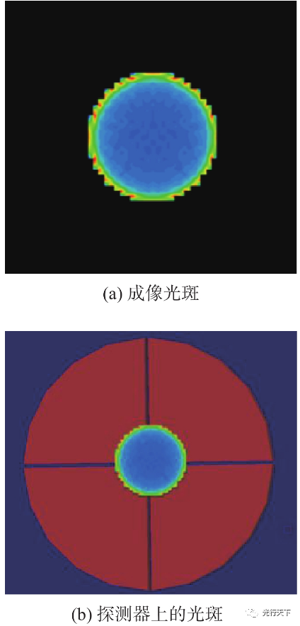 通过上面所建立的探测器模型,在仿真过程中将得到光斑在4个象限的分布,并可以记录4个象限的能量,然后带入(1)式和(2)式,计算得到系统的和差比幅指令输出情况,如图4所示。图4中(a)为通过系统仿真得到的成像光斑;(b)为光斑落在四象限探测器上的情况。