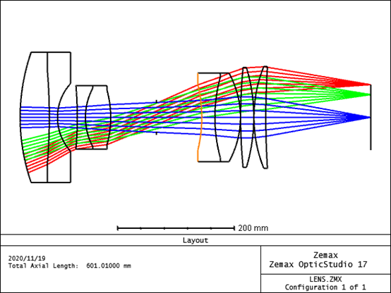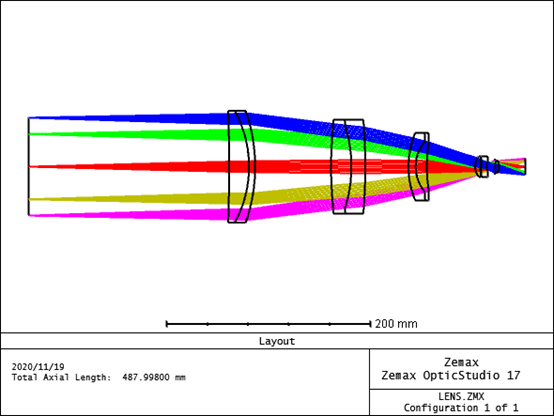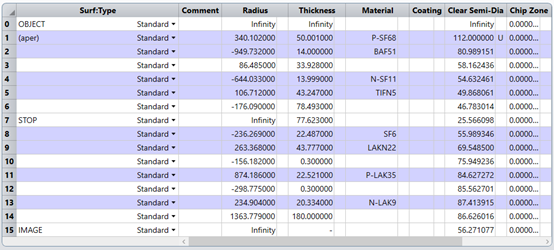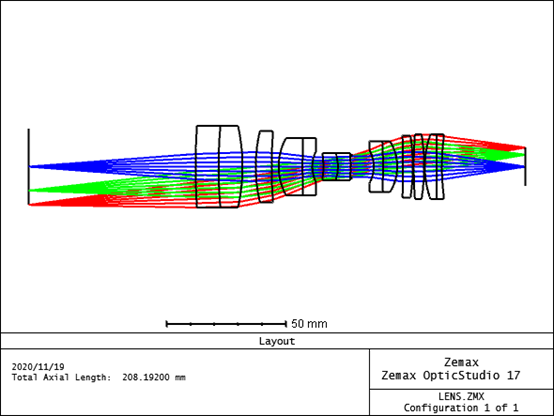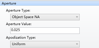 该设计的结构上,与双高斯结构类似,各种非对称像差较小,像质较好,畸变为2.5%,但物镜全长较长。3. 双远心物镜设计一个双远心物镜,F数为2.5,物方视场32mm,像方视场y`为8mm,焦距100mm,放大率β为-0.5。在孔径类型中选择“Image Space F/#”,Apodization Type选择“Uniform”。如下图: