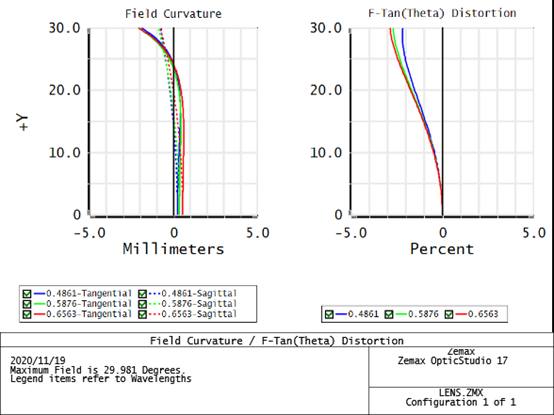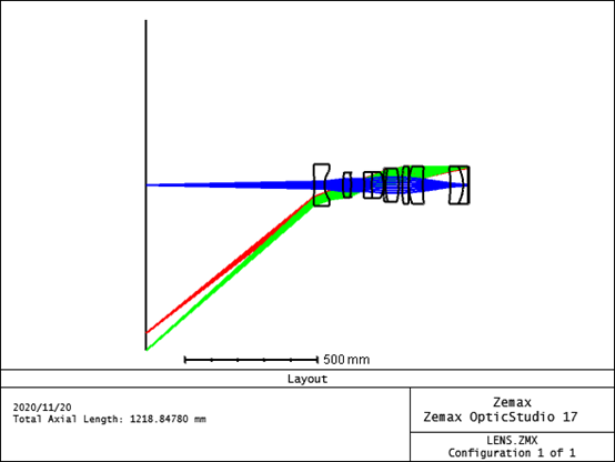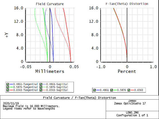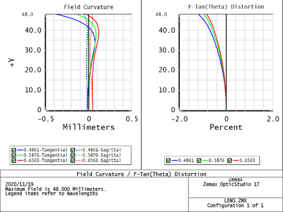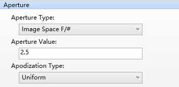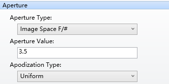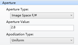 畸变约1.2%,还有继续优化的空间。本设计中,由于物方孔径角较小(u=0.025),它对应的纵向探测距离更大。2. 像方远心物镜设计一个像方远心物镜,F数为2.8,y`为56mm,焦距100mm。在孔径类型中选择“Image Space F/#”,Apodization Type选择“Uniform”。如下图: