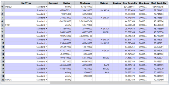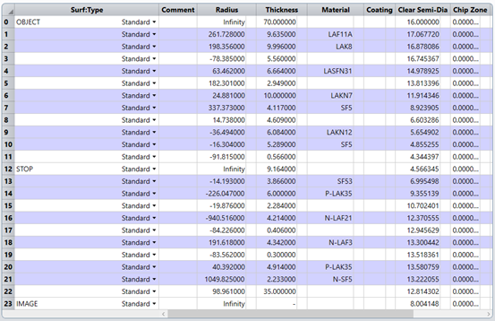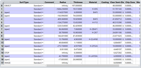 1. 机器视觉用物方远心物镜设计一个用于机器视觉用的物方远心物镜,物方视场为Φ96mm,系统总长291mm,探测器的半对角线η`=8mm,物方孔径角u=0.025。该物镜的前后组已经不明确了,如果以前三组双胶合为前组,后组就是柯克物镜。在孔径类型中选择“Object Space NA”,Apodization Type选择“Uniform”。如下图: