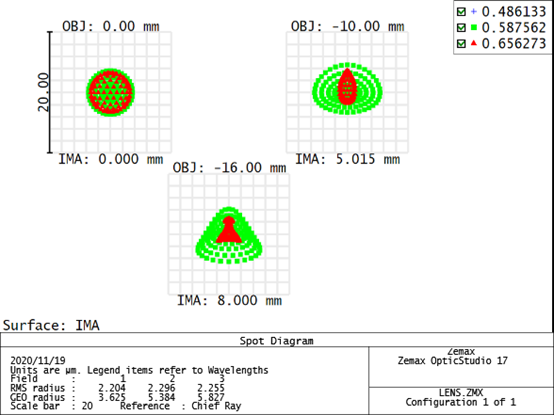 本设计中,物方的离焦和像方的离焦对测量结果的影响都不大,结构布局大体关于光阑对称,像质非常好,畸变<1%。4. 超大视场像方远心物镜设计一个超大视场像方远心物镜,全视场角2ω=127.3度,像面直径190mm,采用114×152mm的LCD,紧贴在负胶合透镜后,物镜前端为大光焦度负透镜,将主光线的视场角放大,可以实现在很短距离(约0.5米)获得非常大的投影像(2.16米×1.62米)。F数为3.5,物方视场2700mm,像方视场y`为190mm,焦距100mm,放大率β为-0.069。在孔径类型中选择“Image Space F/#”,Apodization Type选择“Uniform”。如下图: