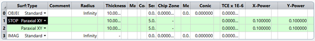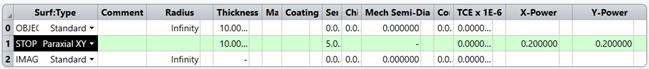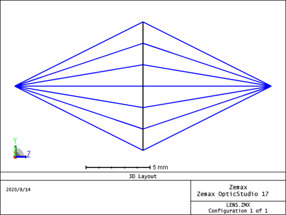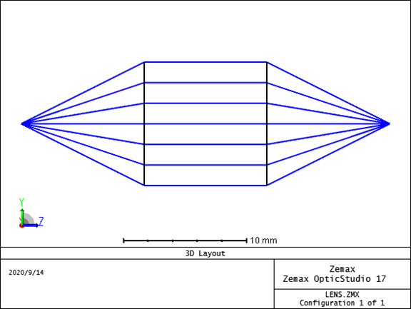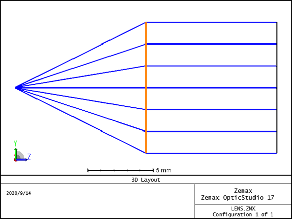 将STOP的面形选为Paraxial XY,这是把该面设置为“理想薄透镜”,其中X-Power和Y-Power可以分别设置两个轴不同的光焦度,即焦距的倒数,我们设置X-Power和Y-Power的光焦度分别为0.2,即焦距为5mm。 需要注意Paraxial和ParaxialXY的区别。Paraxial为旋转对称理想透镜;Paraxial XY为两轴分离理想薄透镜,可以分别设置两个轴的光焦度,如果单独设置一个轴,则成了理想柱面镜。 查看下3D layout,如下图: