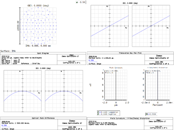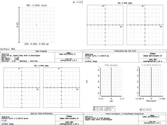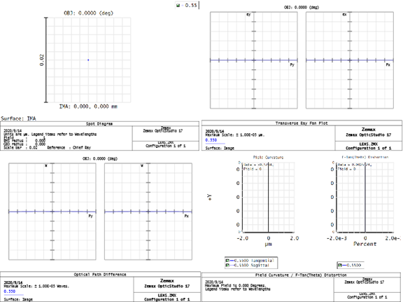 以上这个理想光学成像系统实际上是一个4f系统。 同时打开查看点列图,Ray Fan,OPDFan和Field Curvature,各种像差分析图显示的结果都是0,点列图也为理想点。