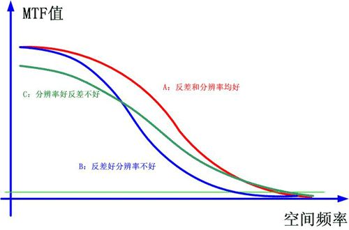 空间频率很低时,MTF值趋于一个接近于1的固定值。这个值实际就是镜头对大面积色块的反差,反映了镜头固有的反差值。随着空间频率增高,MTF值逐渐下降,直到趋于0。人眼对反差为0.05的影像尚能分辩,而当反差低于0.02时就完全不能察觉了。所以一般选定MTF值为0.03时的空间频率作为镜头的目视分辨率。 下图是典型的MTF曲线,利用MTF曲线判断镜头成像质量。