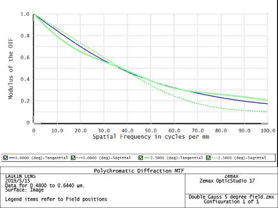 一般的MTF图提供两组不同空间频率的场幅曲线,分别代表反差和分辨率:低频选在MTF频幅曲线水平部分,反映镜头的反差特性;高频选在MTF频幅曲线下降比较陡峭的部分,反映镜头的分辨率特性。 分析MTF曲线基本要领列举如下: 1)MTF曲线越高越好,越高说明镜头光学质量越好。综合反差和分辨率来看,MTF曲线以下包含面积越大越好。 2)MTF曲线越平直越好,越平直越说明边缘与中间一致性好。边缘严重下降说明边角反差与分辨率较低。 3)S曲线与M曲线越接近越好,两者距离较小反映出镜头像散较小。 4)低频(10线对/mm)曲线代表镜头反差特性。这条曲线越高反映镜头反差大。 5)高频(30线对/mm)曲线代表镜头分辨率特性。这条曲线越高反映镜头分辨率越高。