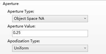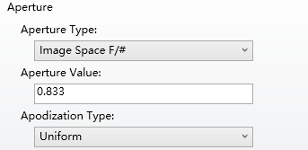 ZEMAX设计举例: 1.设计一个单位放大率的熔凝石英聚光灯,使光源充满0.5in的放映物镜瞳孔,NA为0.25,胶片直径2.0in。 在孔径类型中选择“Object Space NA”,ApertureValue输入“0.25”。 如下图: