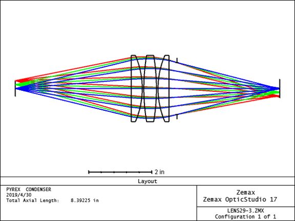 将第4面换成抛物面,可以有效降低球差。 3.设计一个f/0.833派热克玻璃聚光镜,由三块球面透镜组成,放大率为1,胶片直径1.8in,焦距为2.055in,与35mm单透镜反射式胶片的放映物镜相配是足够适合的。 在孔径类型中选择“Image Space F/#”,ApertureValue输入“0.833”。 如下图: