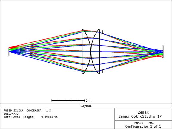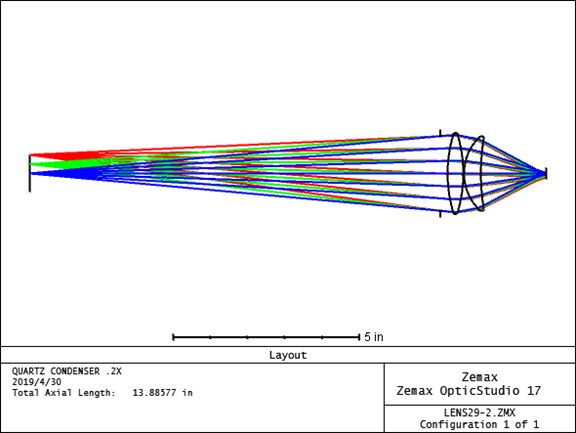 尽管该系统有严重的球差,但它是一个简单而实用的聚光灯,将球面转换成抛物面会使像质有很大提高。 2.设计一个0.2X熔凝石英聚光镜,f#为f/1,使光束充满直径为1.0in的放映物镜的入瞳。 在孔径类型中选择“Float By Stop Size”。 如下图: