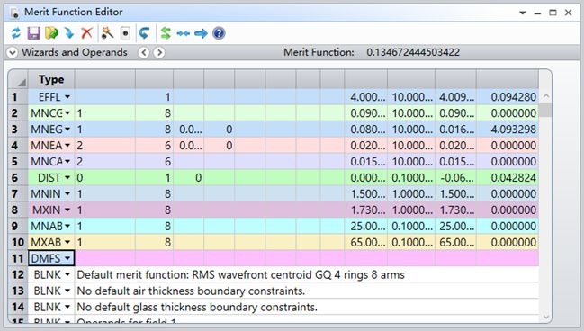 增加以下操作数: EFFL操作数,控制系统焦距,目标值4,权重10; MNCG操作数,控制第1面至第8面的最小玻璃中心厚度,目标值是0.09,权重10; MNEG操作数,控制第1面至第8面的最小玻璃边缘厚度,目标值是0.08,权重10; MNEA操作数,控制第2面至第6面的最小空气边缘厚度,目标值是0.02,权重10; MNCA操作数,控制第2面至第6面的最小空气中心厚度,目标值是0.015,权重10; DIST操作数,控制畸变大小,目标值是0,权重1。 MNIN操作数,控制第1面至第8面的最小d光折射率,目标值是1.5,权重1; MXIN操作数,控制第1面至第8面的最大d光折射率,目标值是1.73,权重1; MNAB操作数,控制第1面至第8面的最小阿贝色散系数,目标值是25,权重0.1; MXAB操作数,控制第1面至第8面的最大阿贝色散系数,目标值是65,权重0.1; 如下图所示: