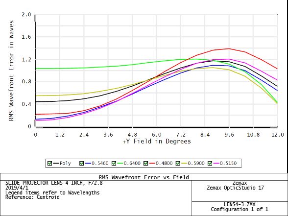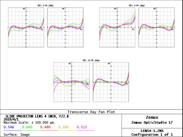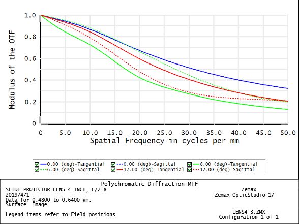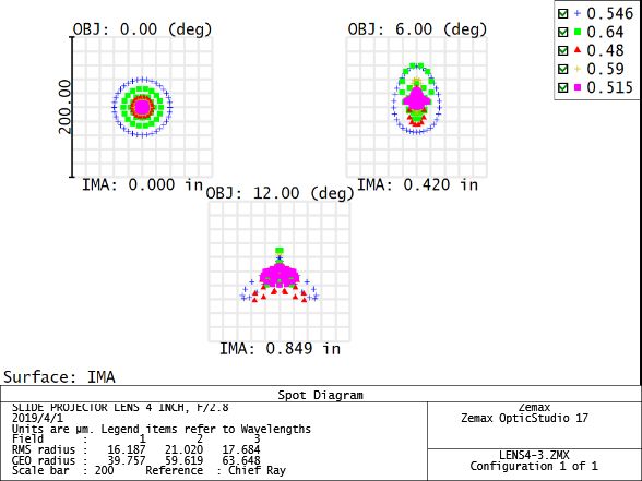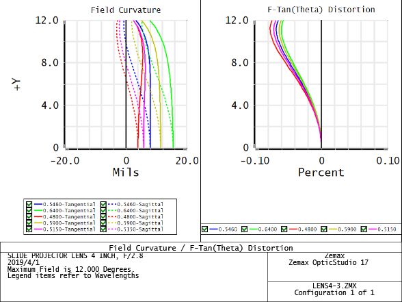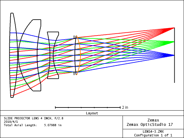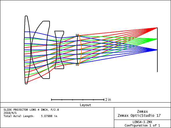 导论: 设计一个幻灯机的物镜,使用的胶片是35mm SLR(单透镜反射式相机)胶片,胶片对角线尺寸是1.703in,焦距为4in,f#为f/2.8,视场为24度。
