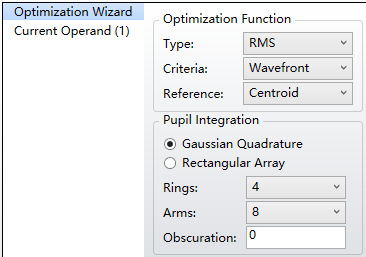 (2)系统优化: 打开MFE,选择“Tools-Default Merit Function”,在评价函数设置对话框中,选择默认的评价函数构成为“RMS+Spot Radius+Centroid”。“Rings”选项为“4”, “Arms”选项为“8”。