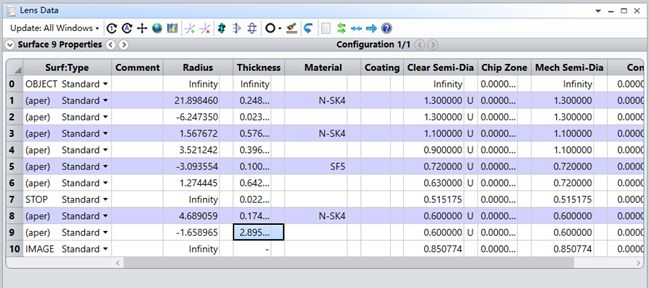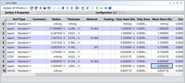 打开LDE,将所有面的半径,各个面的厚度设置为变量,如下图所示: