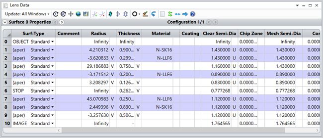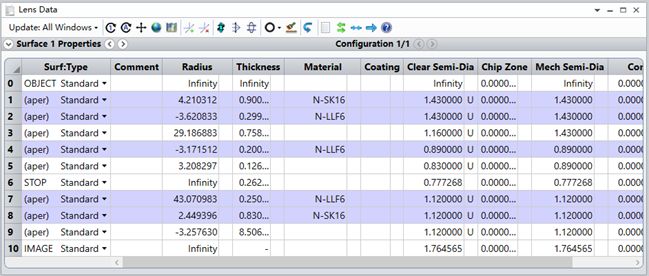 打开LDE,将所有面的半径,各个面的厚度设置为变量,如下图所示: