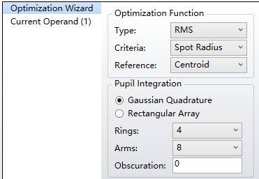 (2)系统优化: 打开MFE,选择“Tools-Default Merit Function”,在评价函数设置对话框中,选择默认的评价函数构成为“RMS+Spot Radius+Centroid”。“Rings”选项为“4”, “Arms”选项为“8”。