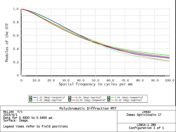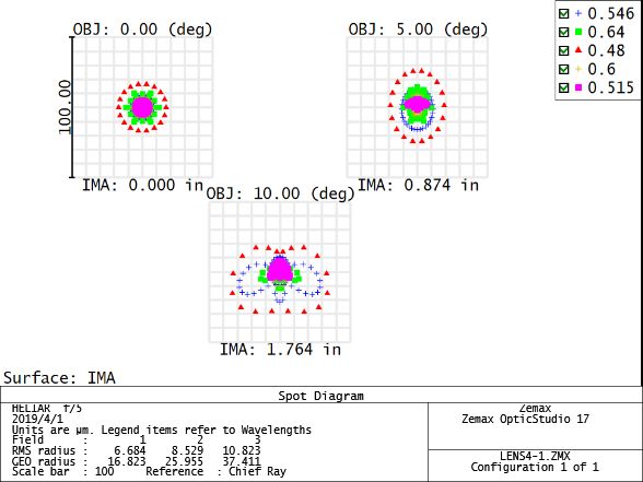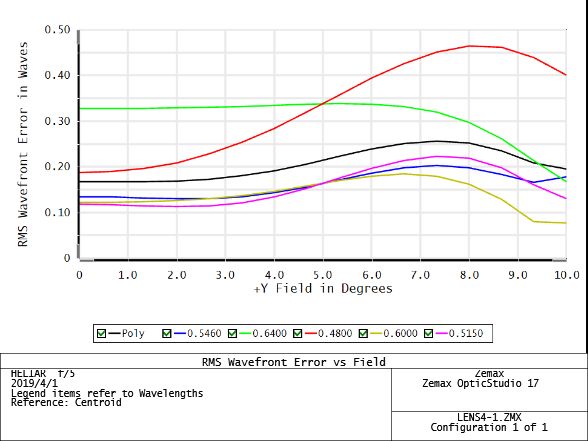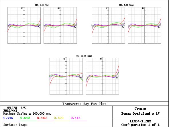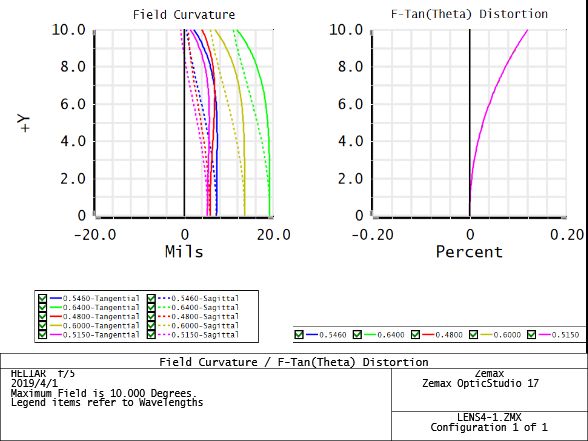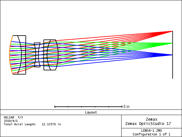 导论: Heliar物镜是一种改进型的三分离物镜,适用于可见光光谱,视场为20镀,f#为f/5,焦距为10in。