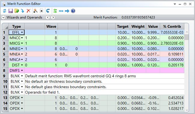 增加以下操作数: EFFL操作数,控制系统焦距,目标值10,权重10; MNCG操作数,控制第1面至第8面的最小玻璃中心厚度,目标值是0.2,权重10; MXCG操作数,控制第1面至第8面的最大玻璃中心厚度,目标值是0.9,权重10; MNEG操作数,控制第1面至第8面的最小玻璃边缘厚度,目标值是0.08,权重10; MNEA操作数,控制第2面至第6面的最小空气边缘厚度,目标值是0.02,权重10; MNCA操作数,控制第2面至第6面的最小空气中心厚度,目标值是0.02,权重10; DIST操作数,控制畸变大小,目标值是0,权重1。 如下图所示: