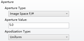 在孔径类型中选择“Image Space F/#”,Apodization Type选择“Uniform”。 如下图: