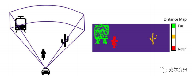 图3:图3:3D 闪光激光雷达(紫色信封)及代表距离图(TOF mapping) 对于50米以下的短距离,3D闪光激光雷达(向外发出的激光脉冲照亮系统的整个视场或FOV)通常效果最佳。对于这些系统,具有均匀能量收集的水平FOV很重要。在下面的示例中,我们考虑这样的闪存系统。目的是在整个FOV的给定检测器区域中获得均匀的封闭能量,以确保在整个传感器可视区域内物体的深度信息。