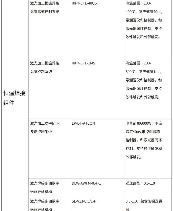 摘要:2022年最新推出的光学仪器——加工温度反馈直接半导体激光器系统,不仅可以输出高功率激光,还能实时反馈焊点工作温度,并做出精准控温以保证焊接的稳定性。此系统控制电压高速响应,TTL出光信号,能兼容激光加工软件,适用于激光锡焊、塑料焊接、高功率半导体激光器泵浦源、激光淬火、表面热处理、激光熔覆金属薄板焊接、3D打印和激光研究等领域。了解更多技术参数,请查看产品型号明细。